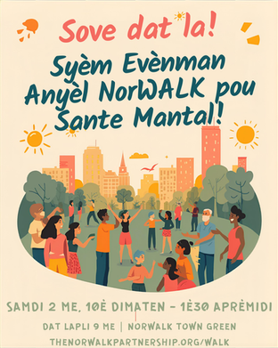 Save the date! Bring your friends & connect with your community at our 5th annual NorWALK for Mental Health event! Join us on May 2 at the Norwalk Green from 10:00 AM to 1:30 PM for a free, family-friendly event featuring a DJ, art, yoga, bouncy houses, a huge wellness fair featuring 50+ community organizations providing activities and resources, an awareness walk, and community speakers -- and food trucks. Rain date: May 9, same time and place.